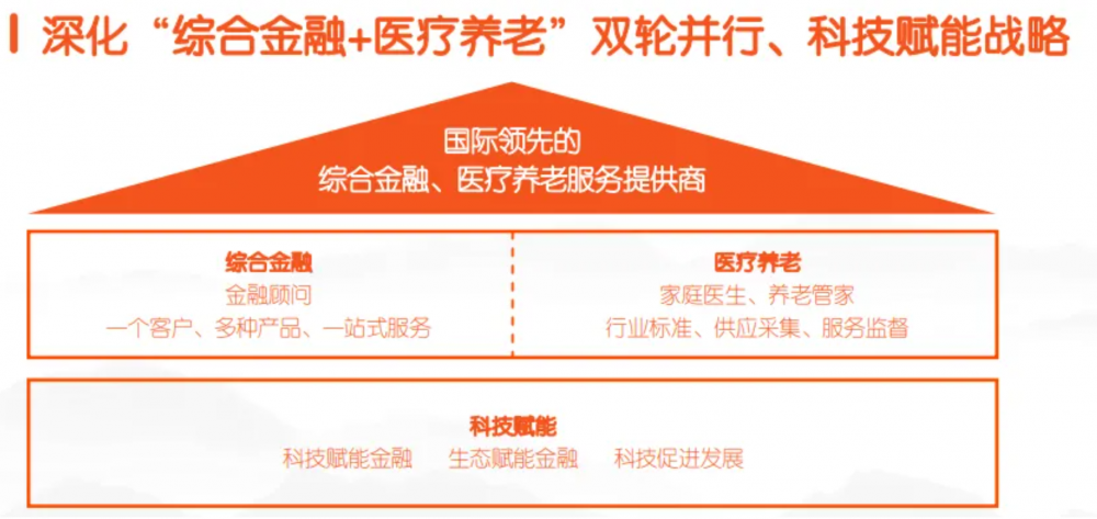 从此维度来看,早在2018年,平安集团就提出“综合金融+医疗养老”双轮并行战略,通过深度融合金融资源与医疗健康、养老服务资源,构建全新的医疗健康生态圈。在这一生态圈中,金融服务与健康管理服务相互融合,从而推动实现从被动治疗到主动预防的转变,也将低频的金融变为医疗健康养老的高频服务。