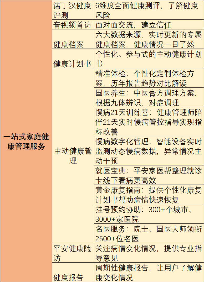 与此同时,全新升级后的“平安家医”还正在打造“11312”的一站式主动健康管理服务体系,即1个专业的、拥有北大医疗国际医院和世界家庭医生组织WONCA双重认证的家庭医生团队;1个由中华医学会全科分会指导、澳大利亚医学会RACGP认证的5A标准服务路径;3套针对亚健康人群、慢病人群、疾病人群的主动健康管理服务;以及提供12项稀缺医疗资源。