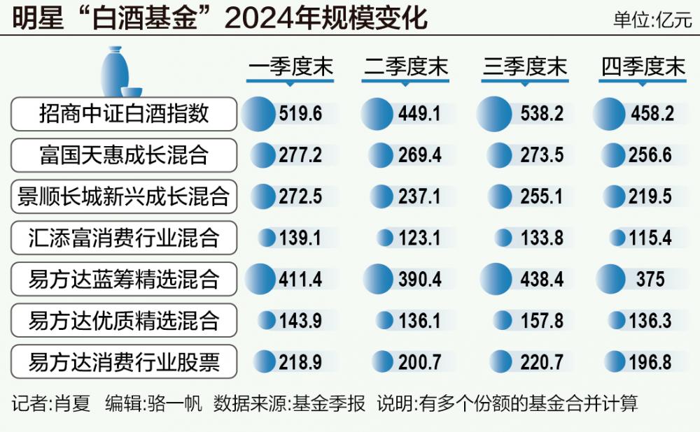 截至2024年末,“最大白酒基金”招商中证白酒指数、张坤管理的易方达蓝筹精选混合的资产规模分别跌回了500亿元、400亿元以下,汇添富消费行业混合、景顺长城新兴成长混合等重仓白酒股的百亿级基金也普遍回调,规模创下年内新低,可见四季度市场热情明显下行。