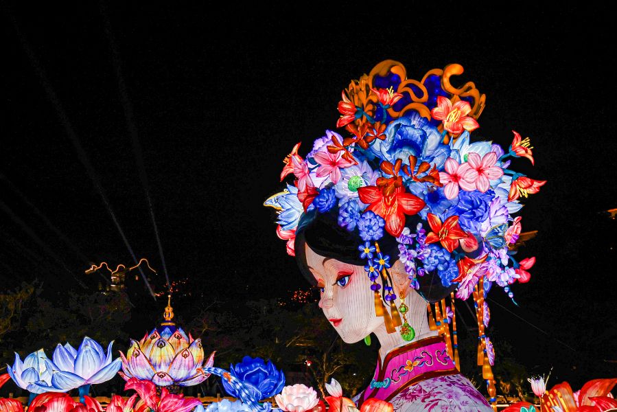 除爆款灯组,本次灯会三大园区、五大主题,一步一景,有“长安”到“罗马”的丝路风情,有“港澳”到“内地”的缤纷味道,有“簪花”到“朋克”的潮流碰撞,极富中国味、最具岭南风、炫动国际范。