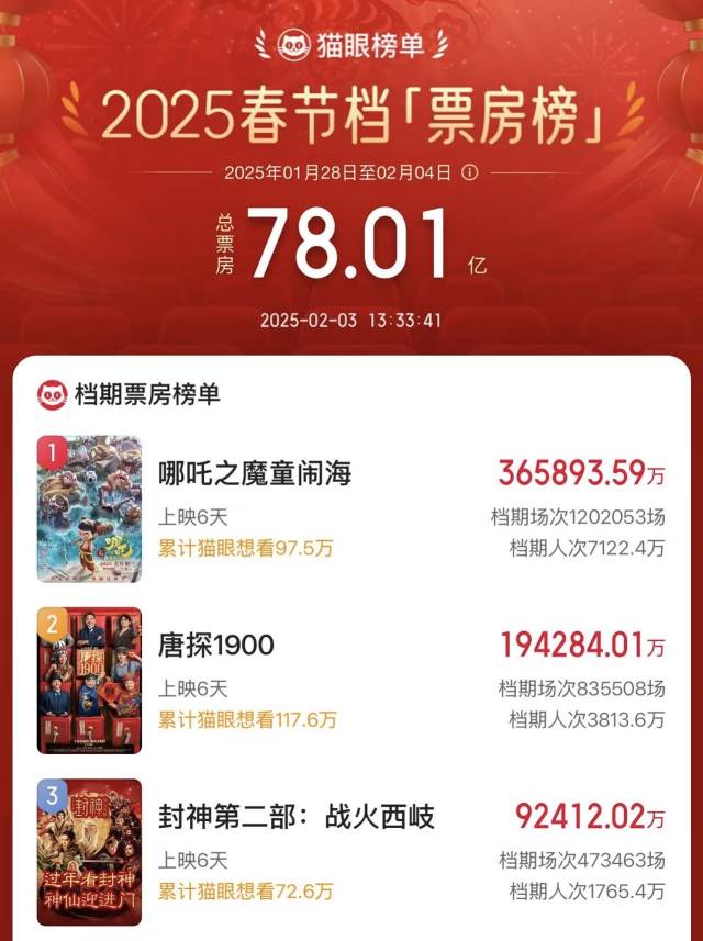 据猫眼专业版数据,2月3日13时33分,2025春节档总票房(含预售)突破78亿元,今日有望刷新影史春节档票房最高纪录(2024年春节档总票房80.16亿元)。《哪吒之魔童闹海》《唐探1900》《封神第二部:战火西岐》分列春节档票房榜前三位,其中《哪吒之魔童闹海》占2025春节档总票房比例超过45%。