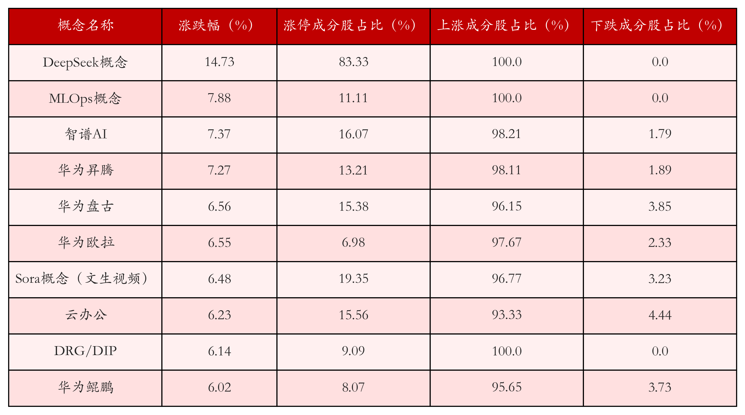 根据A股概念涨跌幅与所对应的股票池综合分析,涨幅靠前的三个概念板块分别为:DeepSeek概念、MLOps概念与智谱AI。排名前10位的概念板块相关数据见下表: