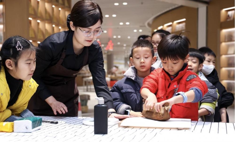 在长安书院三层的书香工坊,专业老师正在带领学生们了解汉字的演变历程,文字载体的变迁,造纸术的出现与改进……“学生们可以通过学习详细了解古法造纸的每一道工序、体验雕版印刷、活字印刷等技艺,在这里过一个传统文化年。”现场老师介绍道。