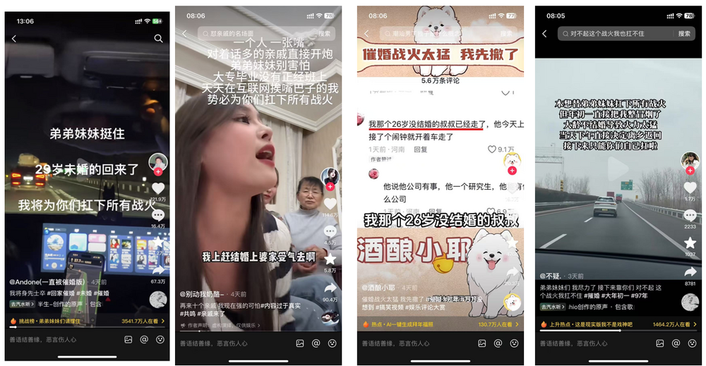 弟弟妹妹挺住,29岁未婚的我回来了,将为你们扛下所有战火!弟弟妹妹们战火太猛,我连夜跑路了,接下来的战火只能你们自己扛。2025年春节期间,类似文案在短视频平台获得高点赞、高转发的背后,正是当下年轻人很难在春节期间,逃过被父母和亲戚的催婚的现实。