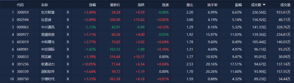 东方财富全天成交额居首,近227亿元。其次是比亚迪、中兴通讯、浪潮信息、中科曙光,成交额分别为157亿元、141亿元、139亿元、105亿元。