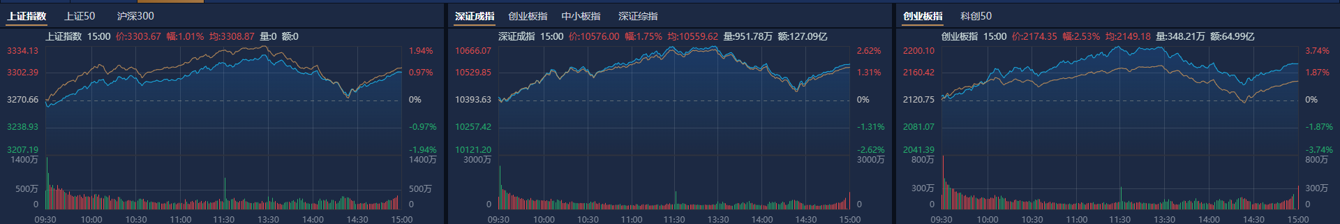 市场全天冲高回落,创业板指领涨。截至收盘,沪指涨1.01%,深成指涨1.75%,创业板指涨2.53%。