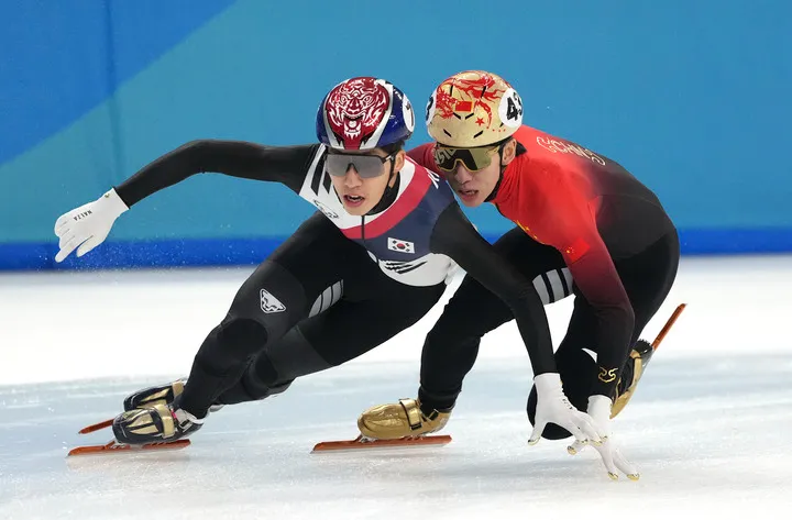 2月9日,中国队选手林孝埈(右)、韩国队选手朴智元在比赛中发生身体碰撞。新华社记者 颜麟蕴 摄