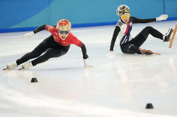 2月9日,中国队选手公俐(左)在比赛中冲刺,韩国队选手金吉莉在比赛中摔倒。新华社记者 颜麟蕴 摄