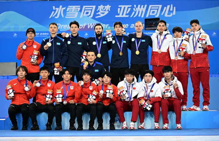 2月9日,冠军哈萨克斯坦队(上中)、亚军日本队(左)、季军中国队在颁奖仪式上合影。新华社记者 颜麟蕴 摄