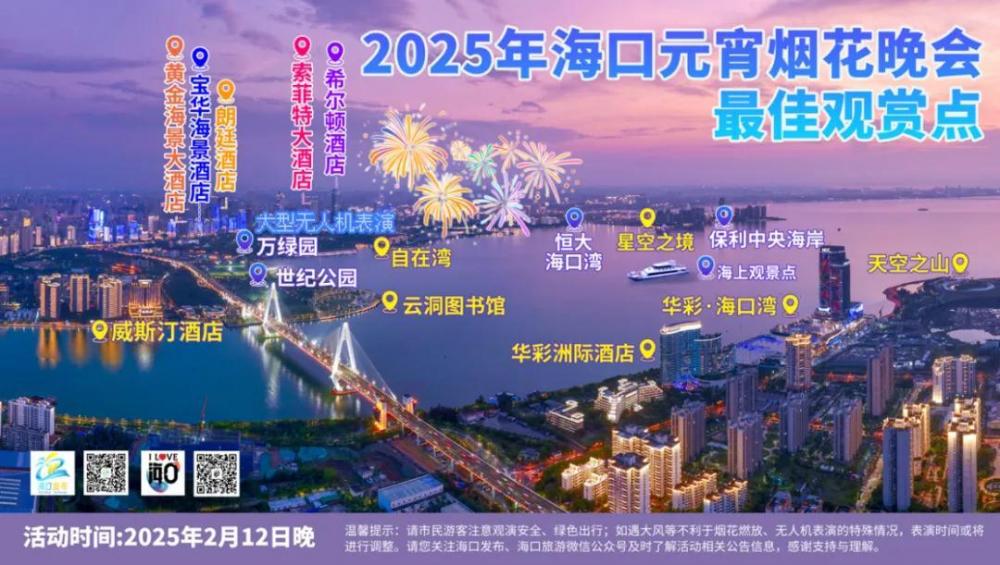 2025年海口元宵烟花晚会于2月12日元宵节当晚在海口湾绚丽启幕,观赏区总长度达6公里,串联天空之山、华彩·海口湾广场、云洞图书馆、世纪公园、万绿园、海口FUNBAY自在湾、星空之镜、保利中央海岸等海口最具文艺范儿的网红打卡点,一湾两岸的市民游客抬头即可观赏到“海上生花”的绚丽美景。当晚,海口各商圈配套推出涵盖美食、住宿、购物、游船夜游、主题市集等系列活动,一个元宵夜多种体验。