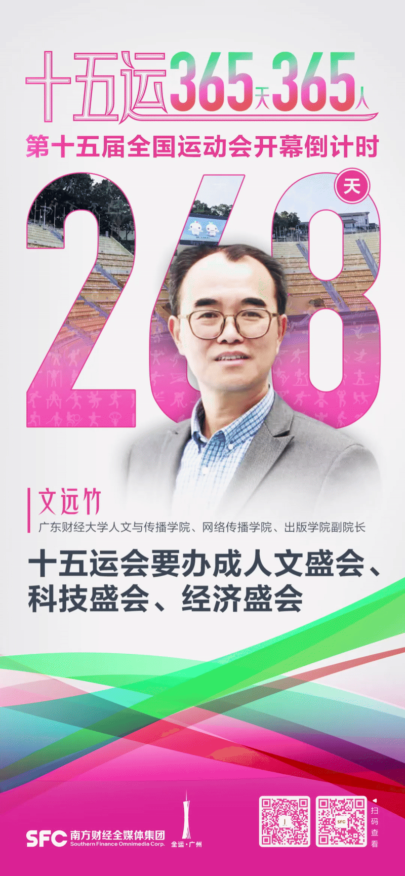 “十五运会要办成体育盛会,更要办成人文盛会、科技盛会、经济盛会。”广东财经大学人文与传播学院、网络传播学院、出版学院副院长文远竹表示,十五运会要展示广州作为岭南文化中心地、改革开放前沿地和千年商都、美食之都、创新之城的独特魅力。同时,要体育搭台,文化、科技和经济唱戏,讲好广州市民、湾区群众与十五运会、全民健身的温情故事,讲好广州经济高质量发展的故事,讲好广州融入大湾区和国家发展战略的故事,讲好人文湾区、休闲湾区、活力湾区的故事。