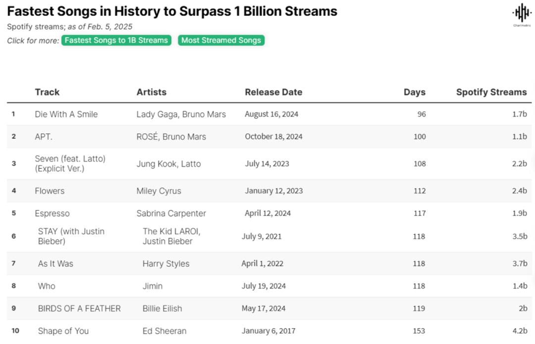 比如2023年5月,Miley Cyrus的《Flowers》在Spotify上发行仅用112天便达到10亿播放,创下了当时的纪录。但同年10月,这一纪录就被Jung Kook和Latto合作的《Seven》打破,只用了108天便达到10亿播放。一年后,Lady Gaga和Bruno Mars的歌曲《Die With A Smile》仅用96天就达到10亿播放,再次刷新纪录。