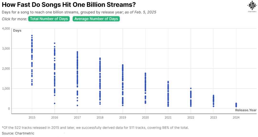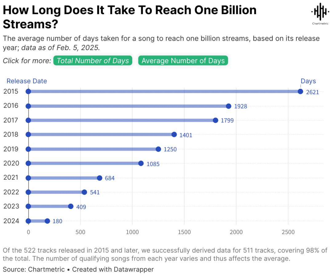 按照发行年份分组,可以清晰地看到,2015年发行的歌曲平均需要2621天(即7.2年),也就是要到2022年左右才能达到10亿次播放量;而2020年发行的歌曲平均仅需1085天(即2.9年),到2024年这一时间缩短至平均180天(即0.5 年)。