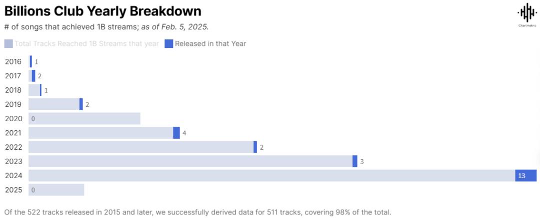 值得注意的是,在2016年至2023年期间突破10亿播放的歌曲中,当年发行的新歌所占比例极低,仅在2021年达到了4首歌曲的相对高峰。然而,2024年有13首歌曲在发行当年突破了10亿播放的大关,预示着流媒体市场开始出现从长尾效应向即时爆款模式的转移趋势。