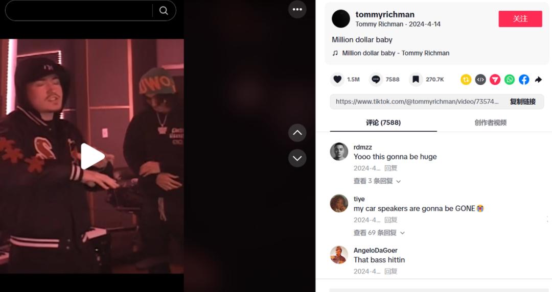 数据显示,2024年Spotify播放量破10亿的14首歌曲中,有12首都在TikTok上引发热潮,歌手Tommy Richman的现象级单曲《MILLION DOLLAR BABY》便是一个鲜活例证。