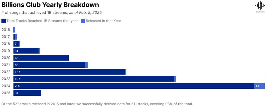 2016年,说唱歌手Drake的歌曲《One Dance》在发行193天后,成为Spotify上第一首播放量达到10亿的歌曲,创造了当时的业界神话。而2025年元旦至今不到两个月,便有34首歌曲成功跻身Spotify的“十亿俱乐部”(Billion’s Club)榜单。