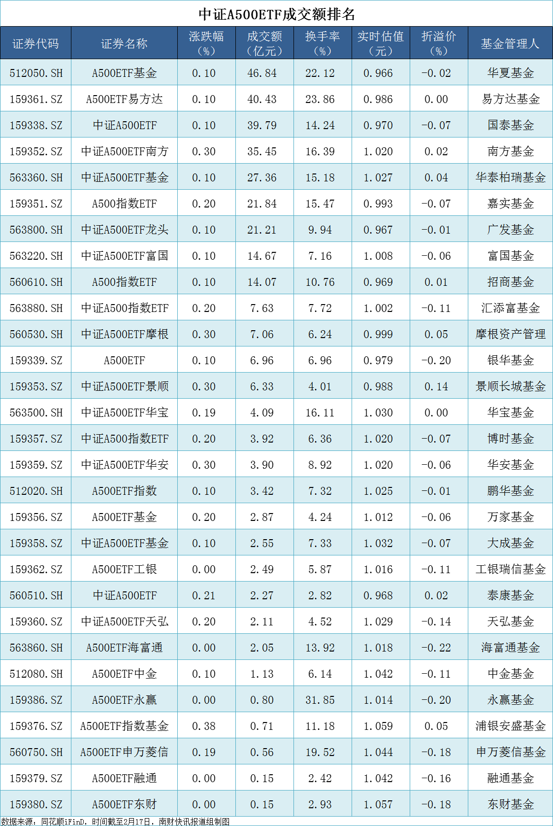 2月17日,市场全天冲高回落,三大指数小幅上涨。沪深两市全天成交额1.94万亿元,较上个交易日放量2265亿元。中证A500指数(000510.SH)今日收盘上涨0.12%,报4681.52点。成分股中,有218家上涨。