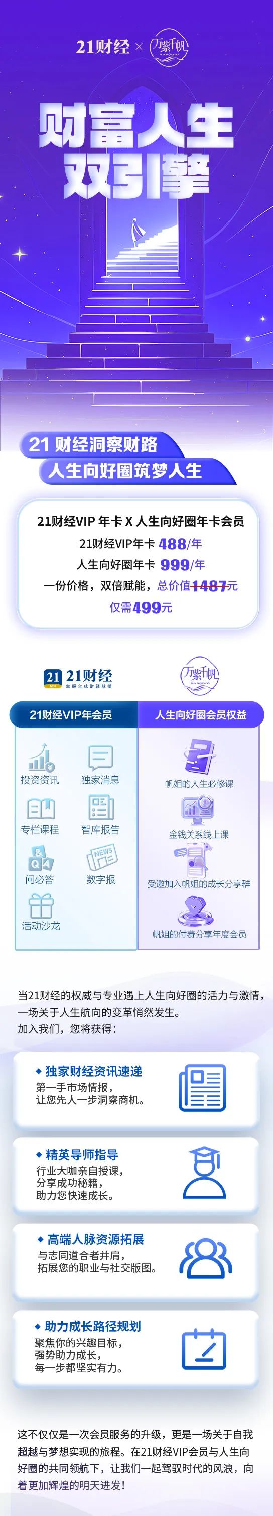 如今,我们身处一个信息如潮水般涌来的时代,人们在面对海量信息的同时,也遭遇着各种各样的难题和挑战。你是否渴望在投资领域和人生道路上都能获得指引和启示?如何在这纷繁复杂的世界中找准自己的定位?怎样提升自身的综合能力和素养?又如何实现个人的全方位成长与发展?这些问题成为了许多人心中的困扰。为了给大家提供一个有效的解决方案,21财经VIP X 千帆人生向好圈联合会员,为您打造全方位、高价值的精英成长与财富增值平台!