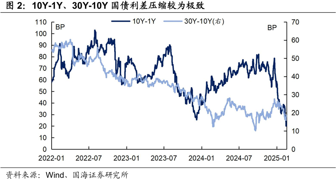 年初以来,央行收紧流动性,带动短端利率上行,同时长端表现一直坚挺,但近两周10年期、30年期国债利率也出现调整,反映资金利率持续高企,负carry环境下,长端利率也会受到冲击。从债券比价角度看,10Y-1Y国债利差、30Y-10Y国债利差压缩较为极致,短期在资金面维持紧平衡状态下,长端利率仍有调整空间。