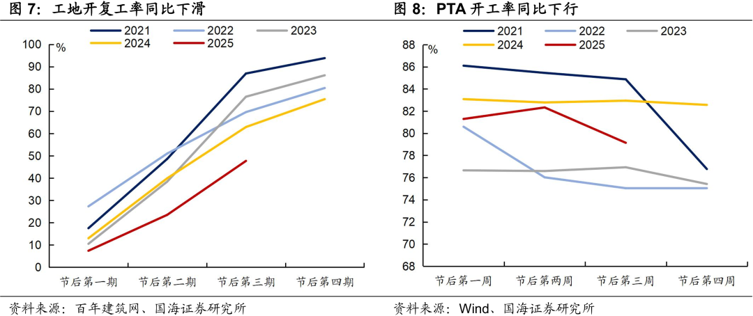 今年春节后复工节奏偏慢,宏观经济数据或走弱。据百年建筑调研,截至2025年2月20日,全国工地开复工率为47.7%,相比去年同期减少15.2个百分点。同时PTA开工率也同比下行,生产复工节奏偏慢。