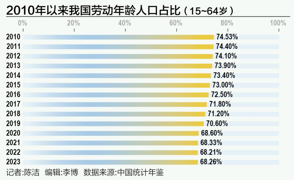 根据中国统计年鉴,2023年,我国劳动年龄人口在总人口中的占比达到68.26%。2010年,我国劳动年龄人口占比高达74.53%,随后尽管有过反弹,但整体来看处于持续下跌的阶段。