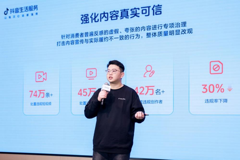 为提升内容质量,平台升级创作者信用体系,通过“以考代罚”等机制,创作者重复违规率下降41%。同时,发布《抖音生活服务低质内容评估规范》,明确盗用、低创、劣质、损体验四大内容质量问题。通过流量管控、达人保证金制度及违规机构责任连带等方式,短视频低质率降低38%,直播录播低质率降低95%。