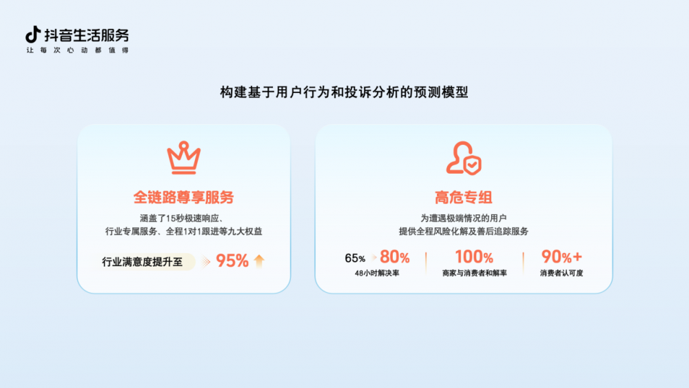 抖音生活服务·服务运营负责人王文远表示,过去一年平台受理消费者服务需求量增长102%。为更妥善地处理用户需求,平台将服务解决率指标全面升级为服务满意度指标。通过构建基于用户行为和投诉分析的预测模型,依据不同行业特性,对用户预期和进线典型场景分类梳理,细化服务标准。同时,积极开展主动服务,全年用户服务满意度整体提升29%。