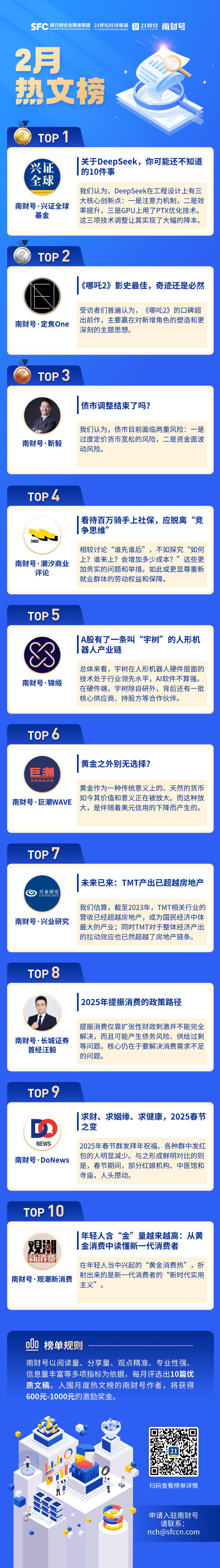 南财号以阅读量、分享量、观点精准、专业性强、信息量丰富等指标为依据,每月评选出10篇优质文稿。入围月度热文榜的南财号作者,将获得600元—1000元的激励奖金。