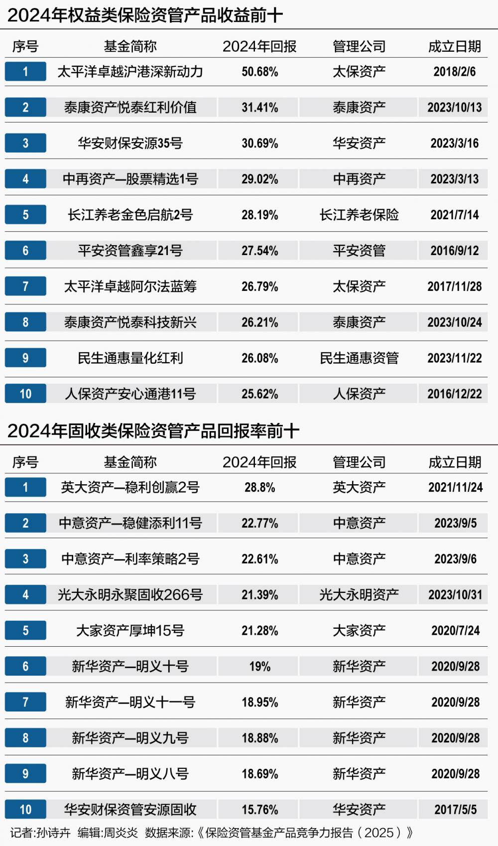 具体来看,2024年权益类保险资管产品收益冠军为太保资产的太平洋卓越沪港深新动力,复权净值增长率为50.68%;泰康资产悦泰红利价值位列第二,复权净值增长率为31.41%;华安财保安源35号则以30.69%的增长率排名第三。此外,上榜的其余产品均取得了超过25%的收益。