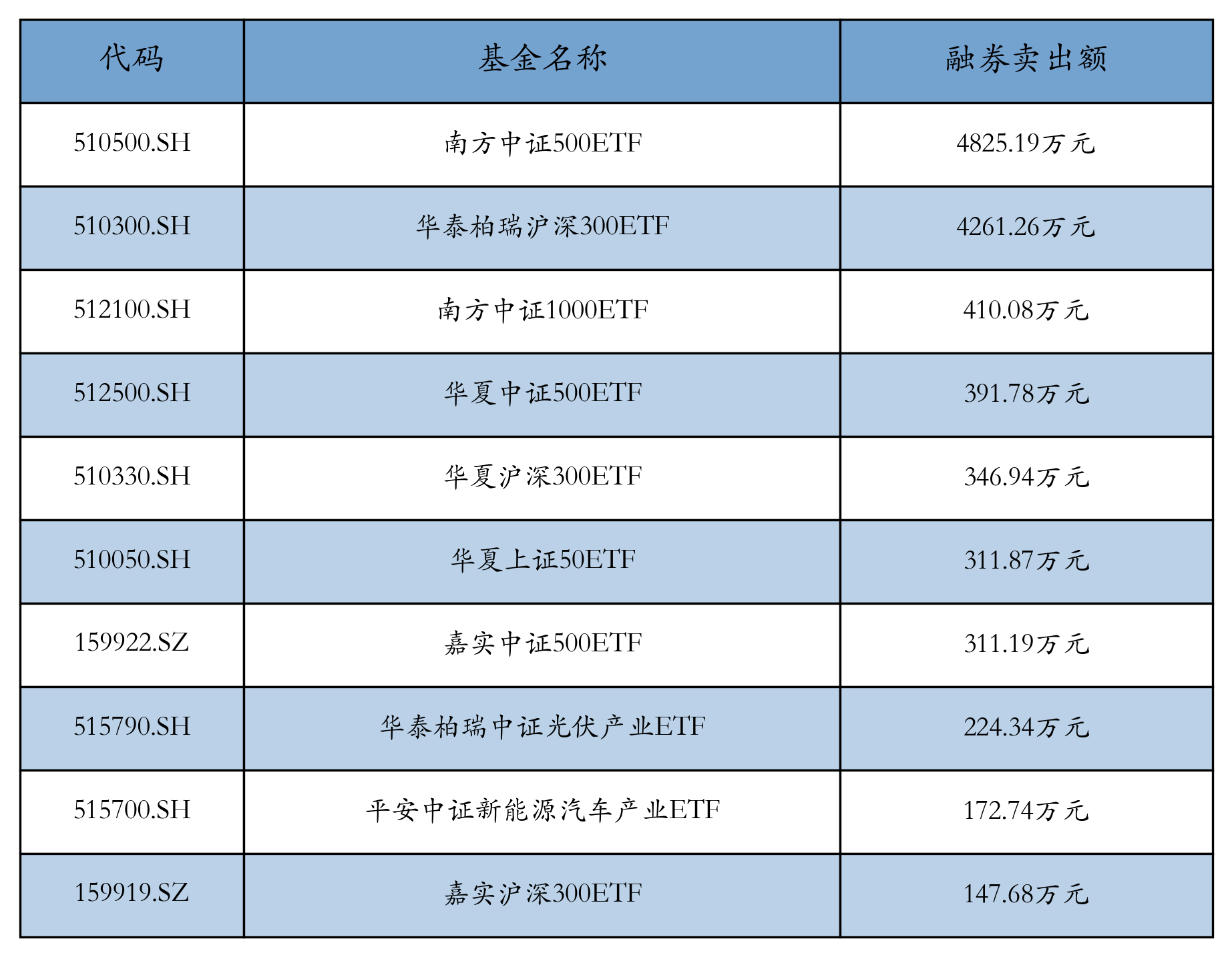 3月3日ETF融券卖出额前三位分别为:南方中证500ETF(4825.19万元)、华泰柏瑞沪深300ETF(4261.26万元)和南方中证1000ETF(410.08万元),前10具体见下表: