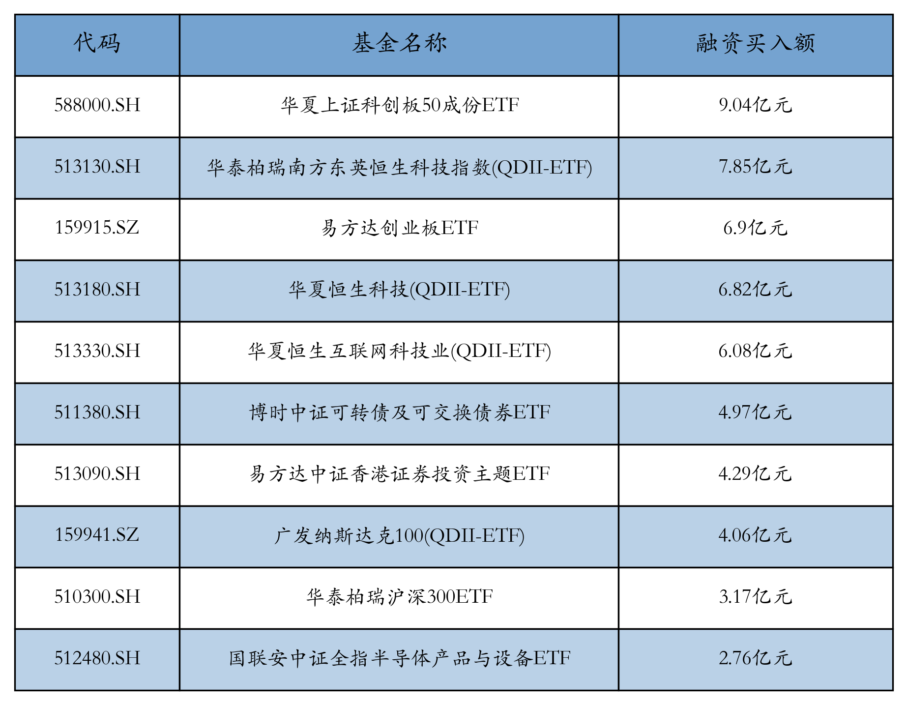3月3日ETF融资买入额前三位分别为:华夏上证科创板50成份ETF(9.04亿元)、华泰柏瑞南方东英恒生科技指数(QDII-ETF)(7.85亿元)和易方达创业板ETF(6.9亿元),前10具体见下表: