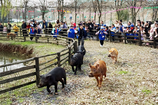 游园会期间,小朋友们在工作人员的指导下进行了赶小猪体验,并观看了小猪跳水表演。小猪们在小朋友的呐喊声中化身体育健将,一个个从3米高台跳下,溅起的一片片水花,宛如春日里一幅美丽的画。