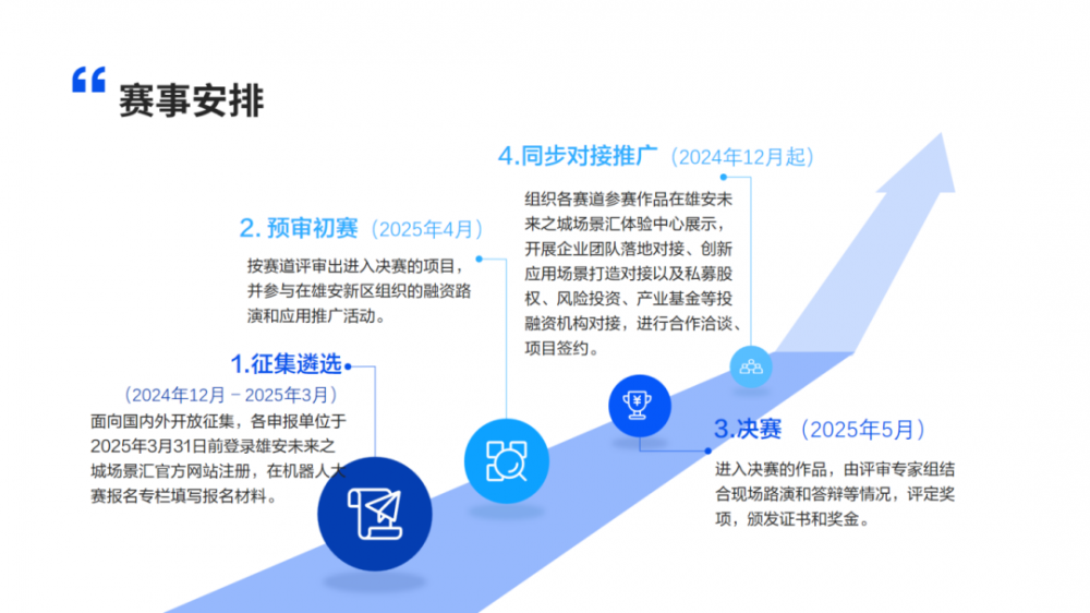 2025雄安国际机器人大赛是第二届雄安未来之城场景汇系列大赛10项赛事之一,由雄安未来之城场景汇组委会主办,河北省工业和信息化厅、雄安新区管委会、唐山市政府、廊坊市政府、河北工业大学、河北省数字经济联合会等单位共同承办。本次大赛将以“机器人让生产更智能生活更轻松”为主题,围绕机器人关键模块、先进技术及新业态三大赛道展开征集,旨在通过大赛的形式,连接技术研发、生产制造、成果转化、产业落地等各环节,打通机器人产业链“堵点”“卡点”,开放开发更多机器人应用场景,推动更多机器人创新成果场景化、产业化。