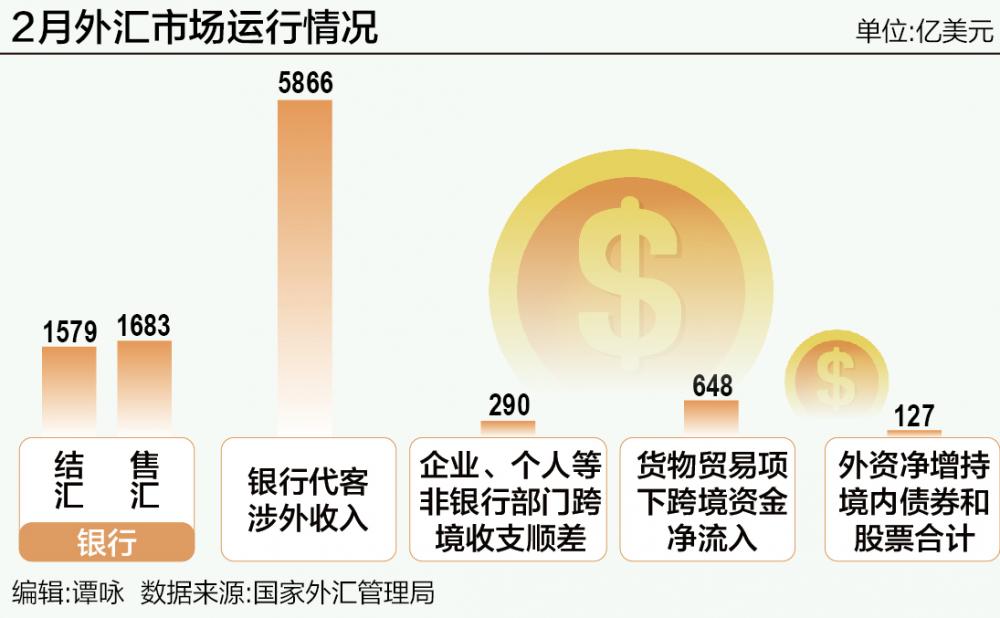 国家外汇管理局数据显示,2月外汇市场运行平稳,跨境资金呈现净流入。国内经济回升向好和科技发展提振市场信心,2月外资净增持境内债券和股票合计达127亿美元。