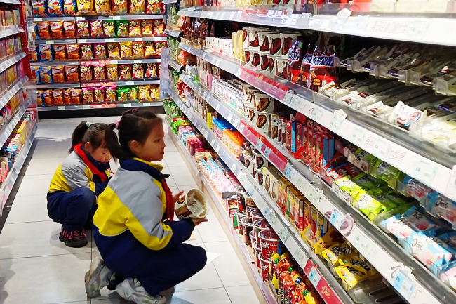 科普课堂结束后,孩子们在工作人员的带领下走进欧家邻里超市,用刚学会的"五看口诀"—看日期、看标签、看资质、看储存、看外观,对货架展开"扫描式"检查,超市负责人连连点赞:“这些小监督员非常专业、非常细致!”