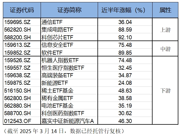 不止是单只产品的领先,嘉实基金在多个细分领域的产品簇也是颇为丰富。以今年大涨的科技赛道为例,从2023年初的ChatGPT引爆市场,后续各种突破性创新作为催化剂,AI产业链的各个细分领域均展现出你方唱罢我登场的热闹格局。下图为截至3月14日,近半年涨幅:
