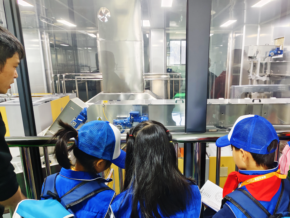 透明化的无菌车间内,全自动吹瓶、灌装、封盖生产线高效运转,小朋友们在参观的过程中,感受到了科技的进步和魅力,同时也激发了大家探索科技的兴趣,在心中种下了一颗科技的种子。