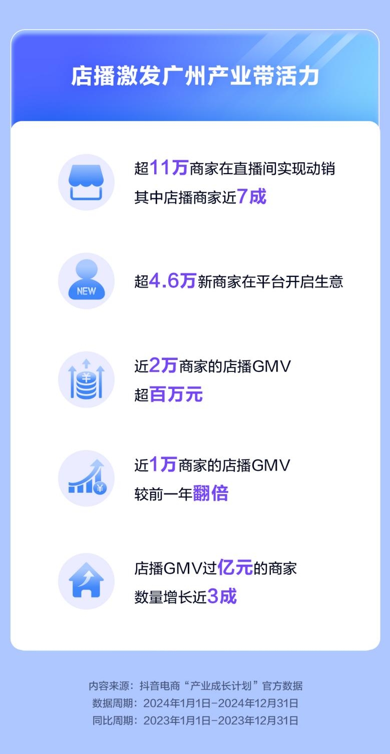 在以货品供应链见长的产业带地区,商家自播已成主流趋势。2024年,广州有11万产业带商家在抖音直播带货打开市场,其中店播商家近7成。店播助力近2万广州商家的销售额超百万元,近1万商家的销售额较上一年翻倍,销售额过亿的商家数量较上一年增长近3成。与此同时,4.6万新商家选择在抖音电商上开拓新生意。