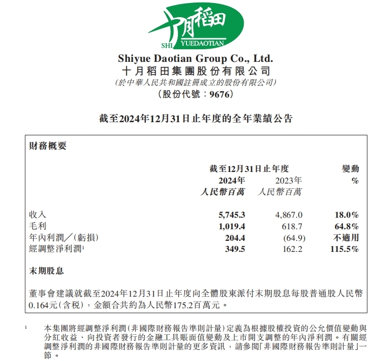 3月24日,十月稻田集团股份有限公司(以下简称“十月稻田”、“集团”或“公司”,股票代码09676.HK)发布了2024年度业绩报告,数据显示,集团录得总收益为人民币5745.3百万元,较2023年同期增长约18.0%;经调整后的净利润由上年度的人民币162.2百万元增长至349.5百万元,增长115.5%;经调整净利润率由上年度的3.3%增长至本年度的6.1%。