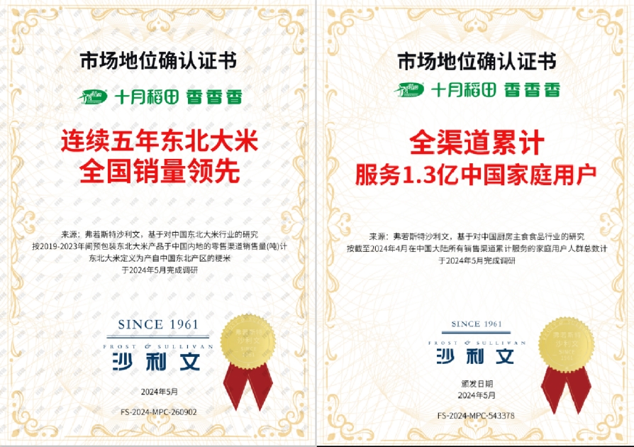 2024年,十月稻田顺应品质觉醒带来“质价双优”的消费新需求,重点调整了大米产业的渠道和产品布局,减少了在低毛利渠道和产品上的战略投入,高端大米占收入的比重增加。2024年十月稻田大米产品收入达到4014.5百万元,占营收比值为69.9%。据弗若斯特沙利文资料,十月稻田获得了“连续五年东北大米全国销量领先”及“全渠道累计服务1.3亿中国家庭用户”的认证。
