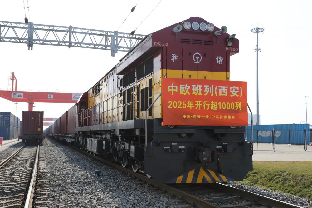 3月21日上午,随着嘹亮的汽笛声,满载着电子产品、机械配件、化工产品等货物的X8489次中欧班列从西安国际港站缓缓驶出,一路向西开往波兰马拉舍维奇,标志着中欧班列(西安)2025年开行量超1000列,较2024年提前8天突破千列大关。