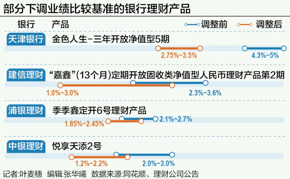 3月24日,天津银行发布《关于“金色人生—三年开放净值型5期”理财产品调整部分产品要素的公告》,该产品的业绩比较基准从之前的4.3%—5%(年化)调整到2.75%—3.5%(年化),下调超过100个基点。