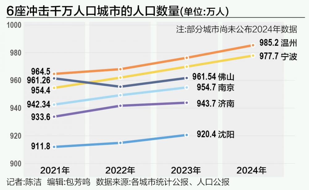 21世纪经济报道记者统计后发现,人口总量超过920万、最新公布人口数据年份(2023年或2024年)仍然保持人口增长的城市,一共有6座,包括温州、宁波、佛山、南京、济南和沈阳,它们保持着冲击千万人口城市的可能性。