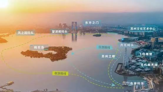 登岛线:沿途观赏当代美术馆、“苏州之眼”摩天轮、“飞翔”雕塑等城市地标后,登上桃花岛游览。