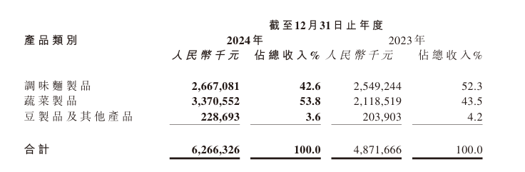 与此同时,在“多品类”产品策略的指引下,卫龙的第二增长曲线愈发稳固。2024年,公司蔬菜制品收入超过调味面制品,实现收入33.71亿元,同比增长 51.9%,占总营收的比例达到53.8%,呈现出快速增长势头。