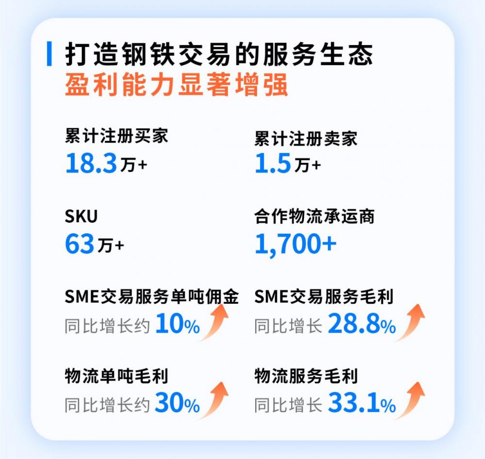在政策的大力支持下,公司业务实现了持续增长,财报数据显示,截至2024年12月31日,钢铁交易平台累计注册供应商超过1.5万家,累计注册客户超过18.3万家,覆盖SKU超过63万种。