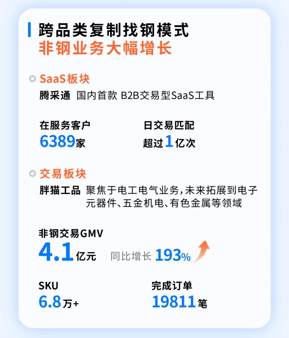 2024年成立的“胖猫工品”则专注于电工电气行业交易服务,截至2024年12月31日,非钢铁行业交易业务累计合作供应商371家,合作客户为1728家,覆盖SKU超过6.8万种,完成订单19811笔。非钢交易业务产生GMV4.1亿元,同比23年增长193%。