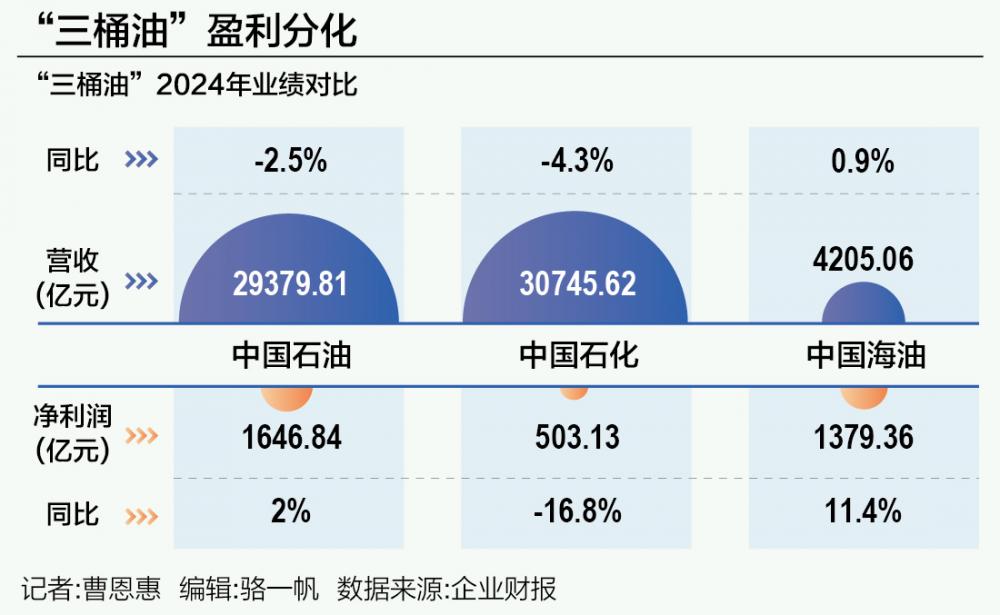 “三桶油”2024年的业绩成绩单悉数出炉。整体来看,中国石油、中国石化和中国海油去年合计实现营收约6.43万亿元,净利润约3529.25亿元。这其中,在营收表现方面,中国石油、中国石化同比有所下滑;在盈利表现方面,中国石油和中国海油同比有所增长。