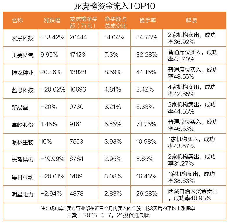 60只上榜的龙虎榜个股中,30只个股被净买入,30只个股被净卖出。其中,资金净买入最多的是宏景科技,达2.04亿元,占总成交金额的14.04%。宏景科技当日收盘下跌13.42%,换手率为34.73%。