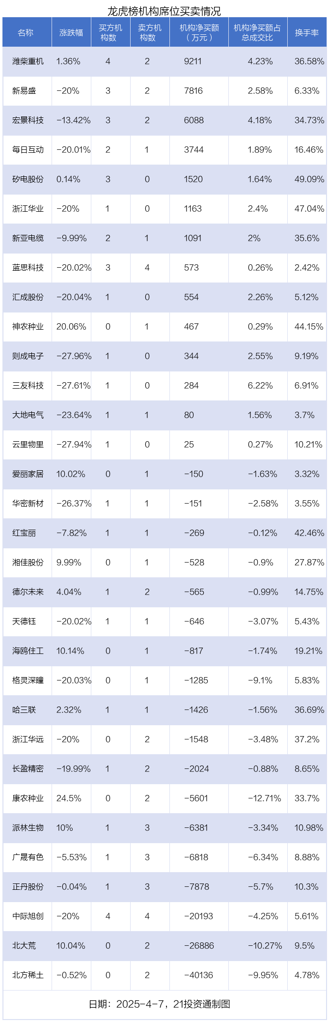 4月7日,32只个股龙虎榜出现了机构的身影,机构合计净卖出9.03亿元。具体来看,机构净买入14股,净卖出18股。